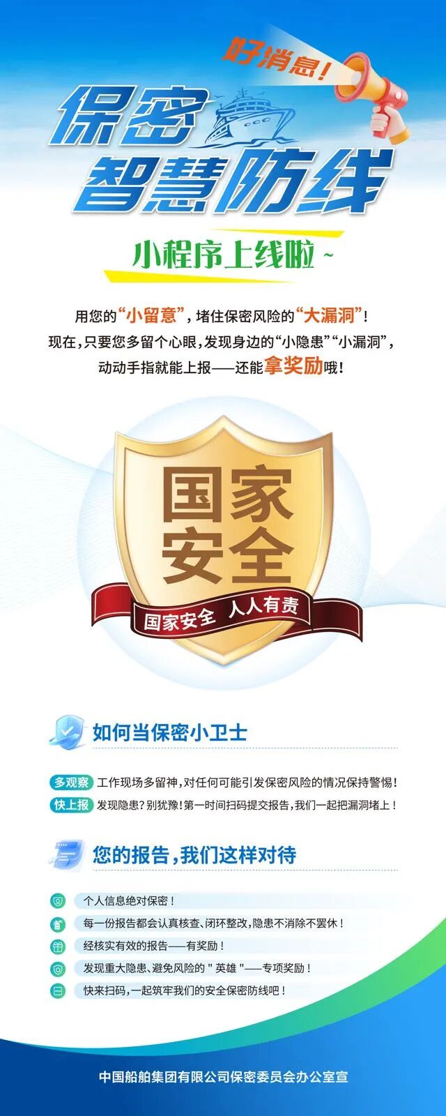 在第十一个全民国家安全教育日到来之际,为深入贯彻落实总体国家安全观,中国船舶集团有限公司“保密智慧防线”小程序正式上线运行。