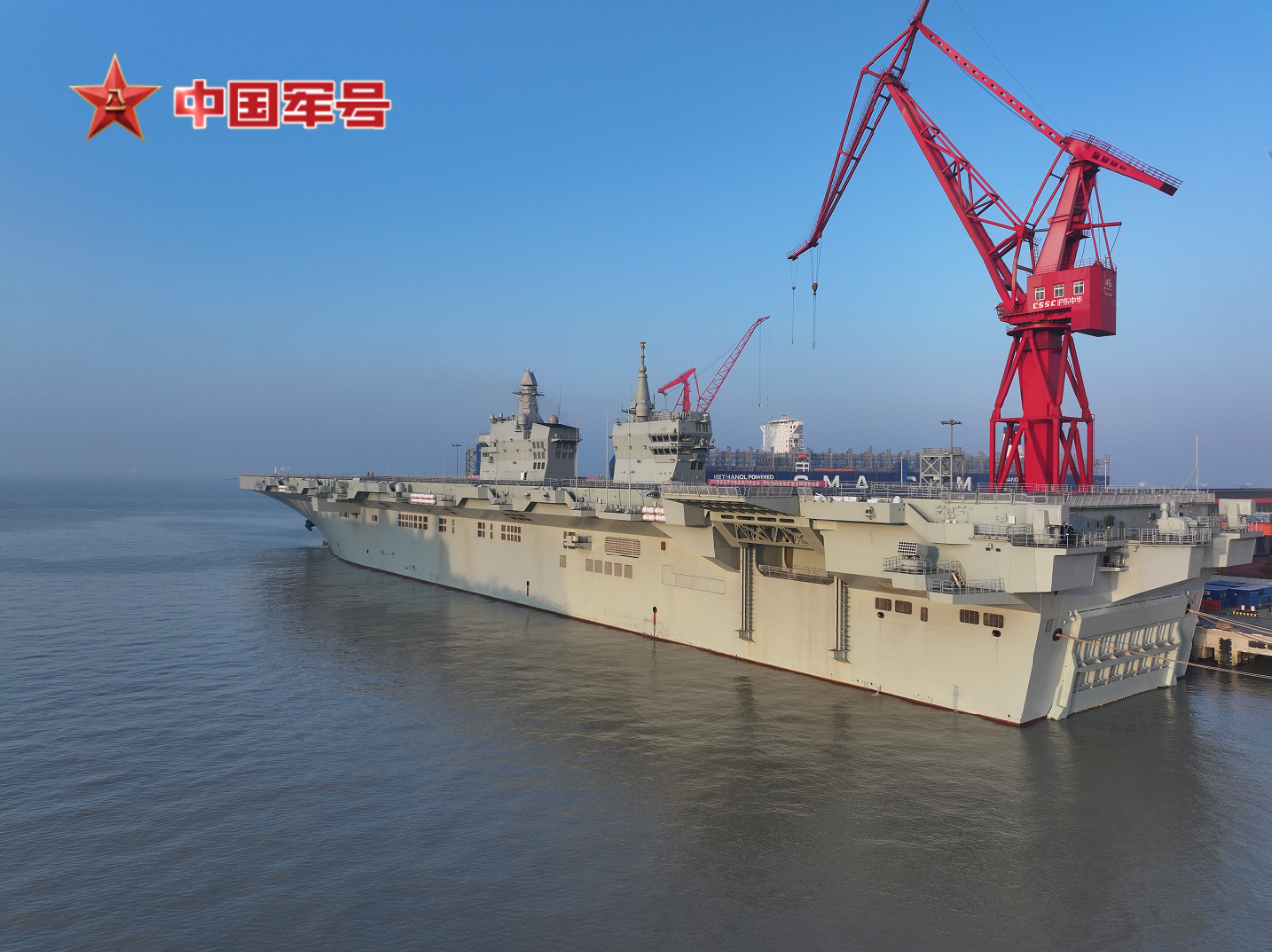 在五艘拖船的牵引下,四川舰离开沪东中华造船厂码头驶向相关海域。四川舰舷号为51,是海军新一代两栖攻击舰,满载排水量4万余吨,设置双舰岛式上层建筑和全纵通飞行甲板,创新应用电磁弹射和阻拦技术,可搭载固定翼飞机、直升机、两栖装备等。