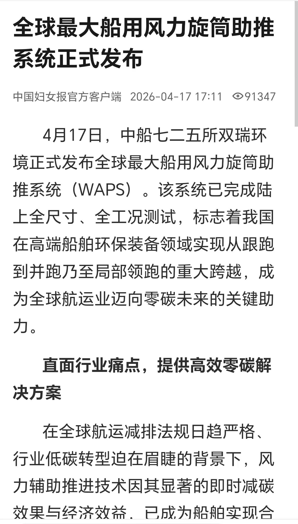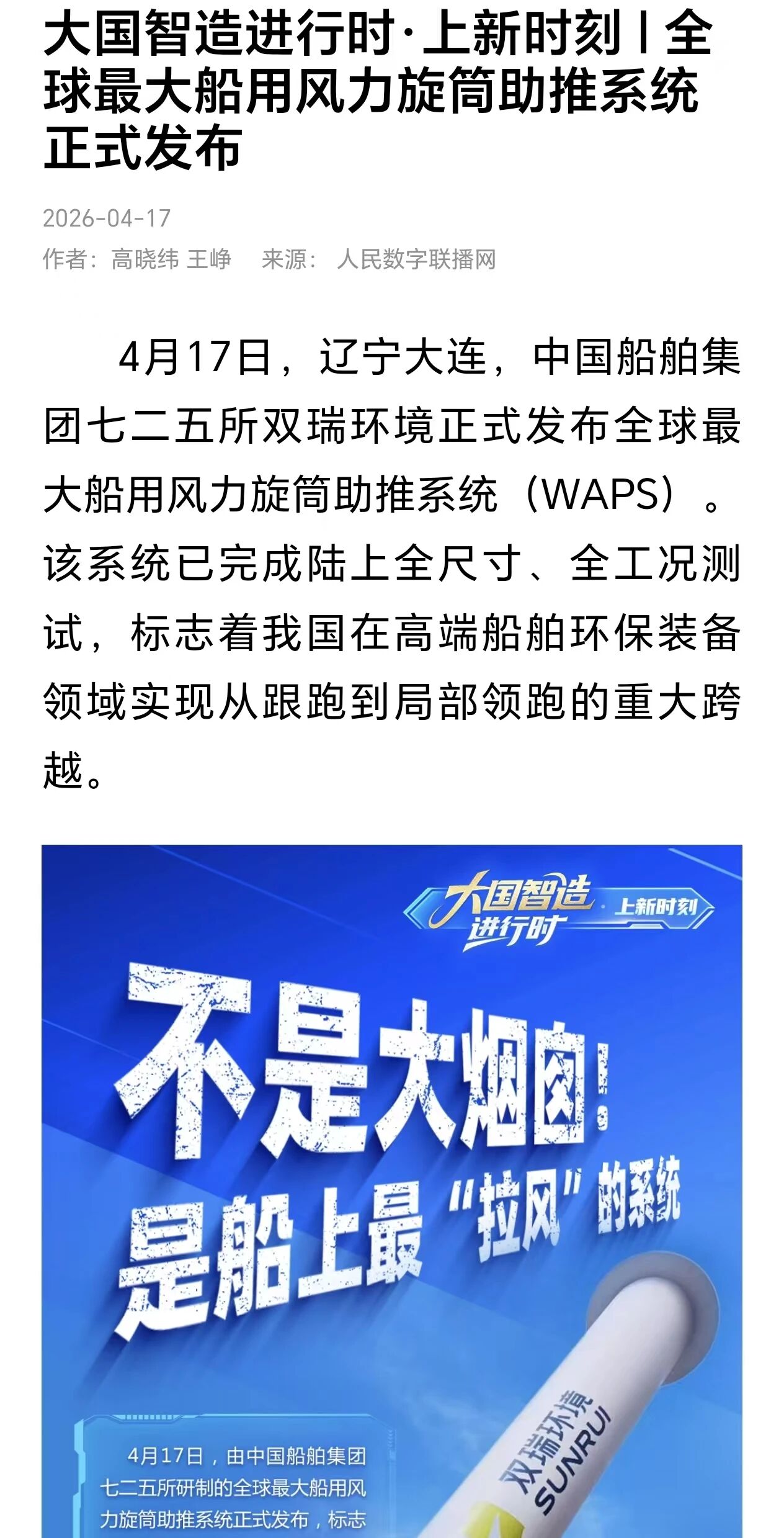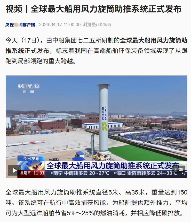 4月17日,中国船舶集团有限公司七二五所旗下双瑞环境正式发布全球最大船用风力旋筒助推系统。 央视、人民日报、新华社、科技日报、半岛晨报等多家中央及地方媒体第一时间关注报道。